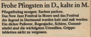 Frohe Pfingsten in D.; kalte in M. (Schlechte Wetterprognose für New Jazzfestival Moers), Ralph Quinke